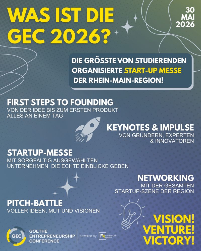 Die größte studentisch organisierte Start-up Messe der Rhein-Main-Region bringt Studierende, Start-ups, Investoren, Unternehmen und Politik am 30. Mai 2026 zusammen. Was dich auf der #GEC2026 erwartet: - First Steps to Founding von der Idee bis zum ersten Produkt; alles an einem Tag - Keynotes & Impulse von Gründern, Experten & Innovatoren - Start-up Messe mit...